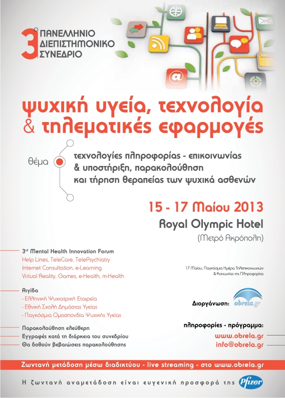 Από την Τετάρτη 15/5/2013 έως και την Παρασκευή 17/5/2013 στο Royal Olympic Hotel διεξήχθη το 3o Πανελλήνιο Διεπιστημονικό Συνέδριο: Τηλεματικές Εφαρμογές και Ψυχική Υγεία με θέμα: Τεχνολογίες Πληροφορίας – Επικοινωνίας & Υποστήριξη, Παρακολούθηση και Τήρηση Θεραπείας των Ψυχικά Ασθενών Help Lines – TelePsychiatry – Internet Consultation – e-Learning – Games – Mobile Health.